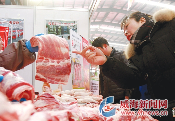 ????在龍大肉食攤位前,呂志麗和崔春花幾乎挑花了眼。“給我來塊瘦肉,過年想在家做烤肉。”呂志麗對銷售人員說道。“想吃烤肉的話還是別選瘦肉,五花肉最合適了。”呂志麗聽從銷售人員的建議,買了塊五花肉。站在旁邊的崔春花選了生豬肝和豬血,她說,全家人都喜歡這一口。