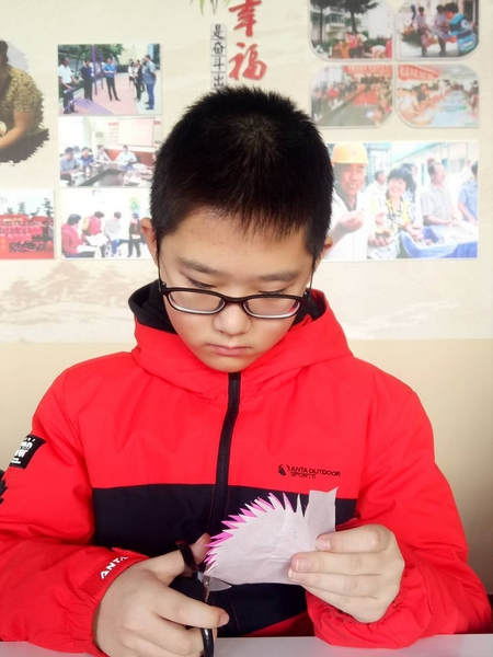 看,這個小同學學起剪紙特別專注。