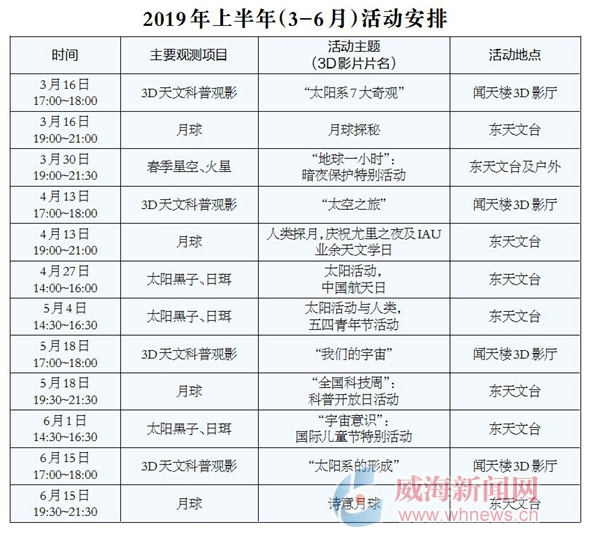 據山東大學威海天文臺工作人員介紹,該臺2019年面向公眾的天文科普與觀測活動定為3月至7月、9月至11月,具體為平均每月2次的月球、大行星等天體觀測(晚間)以及太陽觀測(白天),時間為周末或節假日。