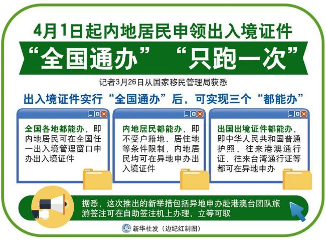 4月1日起出國出境證件實行“全國通辦”。即內(nèi)地居民可在全國任一出入境管理窗口申請辦理,申辦手續(xù)與戶籍地一致。