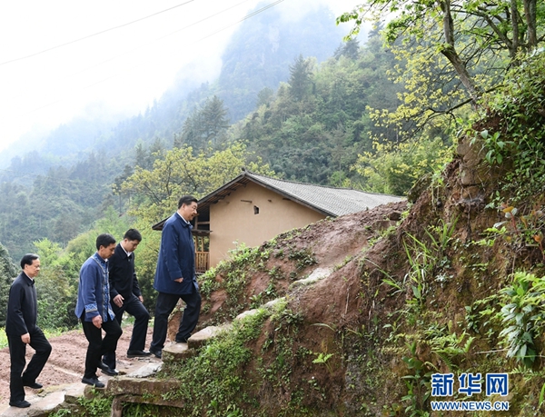 ????這是4月15日下午,在石柱土家族自治縣中益鄉華溪村,習近平踏著濕滑的石階登上陡坡,前往貧困戶譚登周家看望。 新華社記者 謝環馳 攝