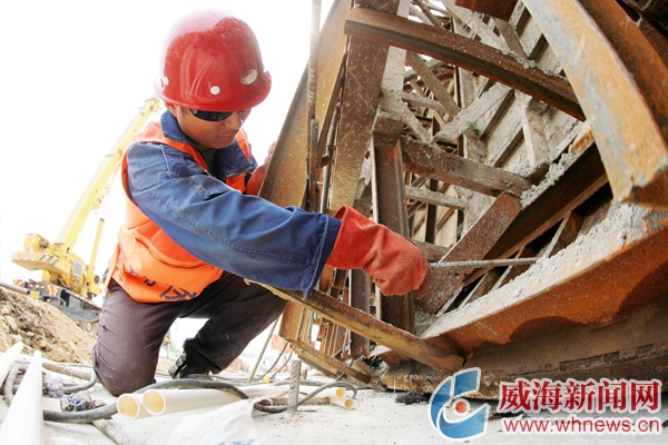因統(tǒng)一南路(嶗山路-膠州路)道路施工比原計(jì)劃提前兩個(gè)月完工,工期變得十分緊張,“五一”小長(zhǎng)假,30多名市政工人放棄休假,奮戰(zhàn)在這里,今年33歲的電焊工孟慶國(guó)就是他們中的一員。