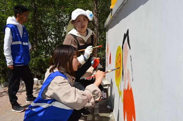 這些墻體彩繪是5月6日完成的。當天8時30分,20余名志愿者來到現(xiàn)場,并分組合作繪制圖案。經(jīng)過一天的努力,原本平白無奇的白墻充滿了繽紛和諧的色彩和圖案,立體豐富,趣味盎然。