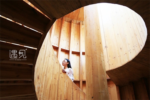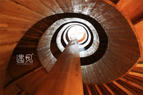 觀光塔是純木制,陽光從頂端灑下,旋轉構造的樓梯多了幾分意境。