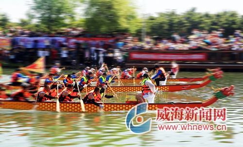 明珠河畔,浪花飛濺,鼓聲雷動,熱鬧非凡。6月7日,山東省第九屆全民健身運(yùn)動會暨威海南海新區(qū)第五屆龍舟邀請賽在此擂響戰(zhàn)鼓,由當(dāng)?shù)鼐用窈屯鈬魧W(xué)生組成的17支參賽隊(duì)伍同場競技,揮槳“攪沸”明珠河。