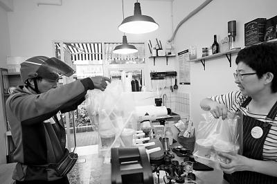 ????店員將通過網絡訂購的咖啡交給外賣員。新華社發