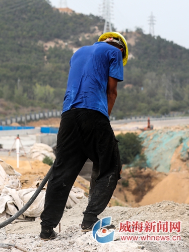 環(huán)山路附屬設(shè)施施工現(xiàn)場,工人們在高溫下作業(yè),汗流浹背。 記者 孫大偉 攝