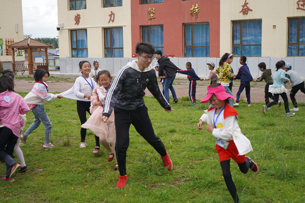7月31日,在青海省門源縣青石嘴鎮大灘小學,前來支教的威海籍大學生畢鄒彬和同學們正跟當地孩子做游戲。7月20日以來,來自浙江大學竺可楨學院赴青海門源支教團的畢鄒彬等22名大學生,利用暑假來到門源縣開展支教活動,發揮專業學科優勢與思維優勢,開設了小學班與高中班進行教學,除了文化課外,還創造性地開展書法、繪畫、話劇、電影賞析等課程,受到了孩子們的歡迎。