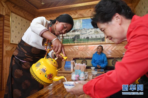 甘肅省甘南藏族自治州碌曲縣尕海鎮尕秀村村民扎西拉毛(左)在自家的牧家樂里為游客倒奶茶(2018年8月10日攝)。新華社記者 陳斌 攝
