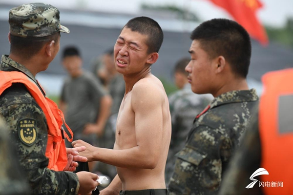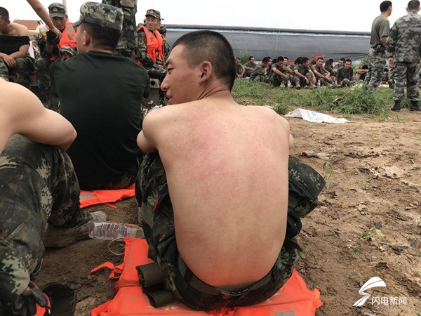 不少奮戰(zhàn)在抗洪救災一線的戰(zhàn)士,因為身體長時間被雨水和汗水浸泡,身上生了痱子,風一吹,瘙癢難耐。
