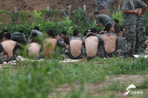 趁著中午休整的時間,不少戰(zhàn)士脫下上衣,露出發(fā)紅的后背,擦拭消毒液殺菌。