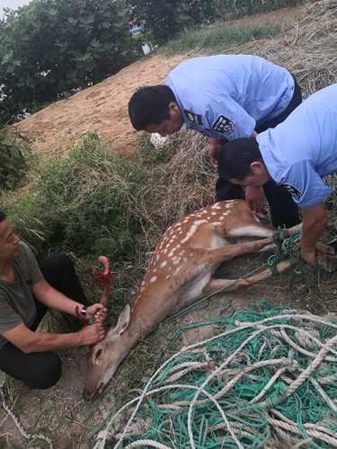 ????將梅花鹿救到船上后,他們駕船駛回岸邊,并撥打110報警求助。梅花鹿上岸后雖疲累不堪,但仍野性十足,不許人靠近,并伺機逃跑。不得已,工人們用繩索固定鹿蹄,以防梅花鹿跑脫無法對其進行施救。很快,市公安局經區(qū)分局崮山邊防派出所民警趕到現(xiàn)場,查看情況后,聯(lián)系有關部門工作人員到場,將梅花鹿運回去檢查救治。