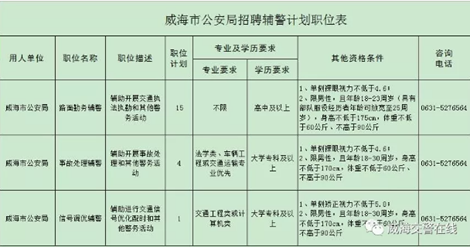????威海市公安局因工作需要計(jì)劃面向社會(huì)公開招聘警務(wù)輔助人員(以下統(tǒng)稱“輔警”)20名想報(bào)名的千萬不要錯(cuò)過哦~