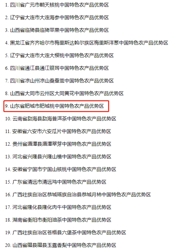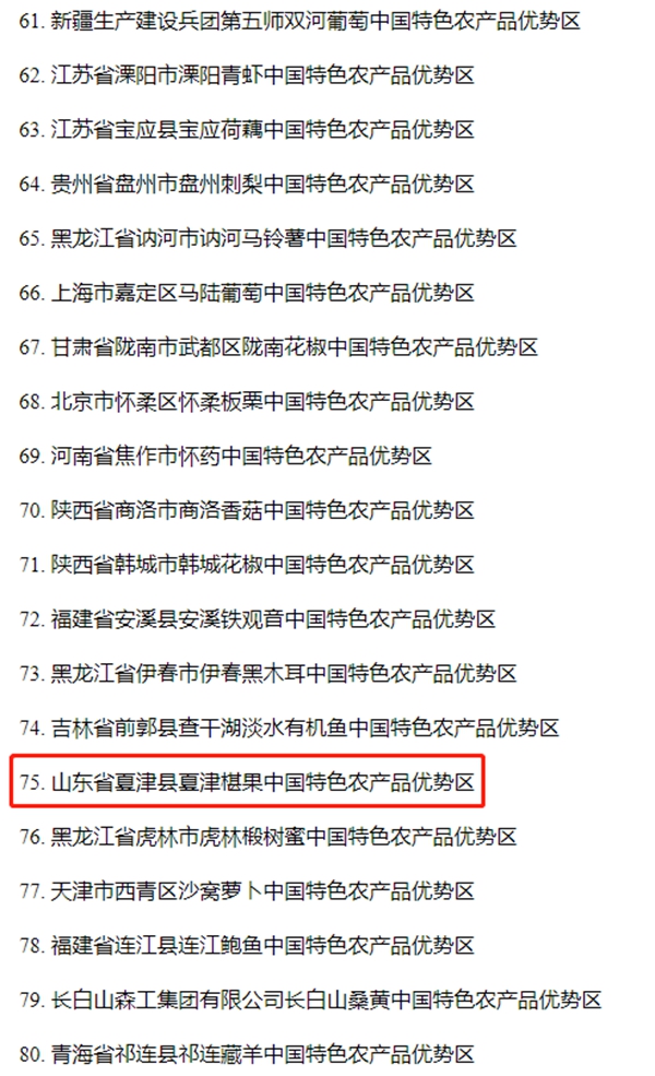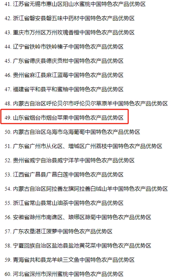 ????此次公布中國特色農產品優勢區共83個,山東有4個,分別是:肥城市肥城桃中國特色農產品優勢區、膠州市膠州大白菜中國特色農產品優勢區、煙臺市煙臺蘋果中國特色農產品優勢區、夏津縣夏津椹果中國特色農產品優勢區。(來源:閃電新聞)