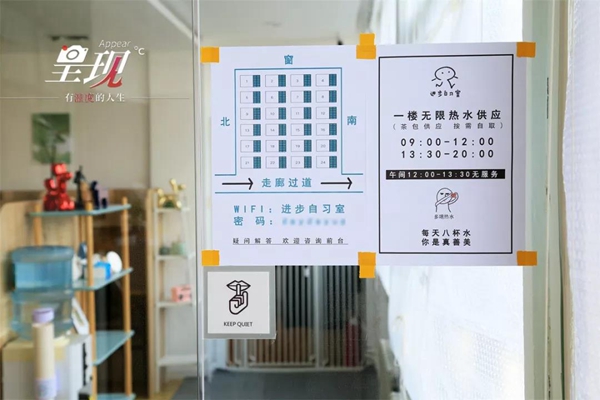 ????自習室為學生提供熱水、茶包和WIFI服務,每一個座位都打造成了“格子間”,小小的空間配置了插座、臺燈、臨時儲物柜,功能齊備。