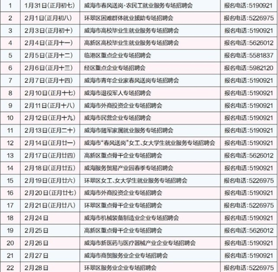 ????為切實做好高校畢業生、城鄉勞動者等各類群體就業服務工作,滿足春節后我市重點區域和重點產業發展用人需求,1月31日(正月初七)至2月28日,威海市人力資源公共服務中心擬于市人力資源市場(膠州路7號市人力資源社會保障局二樓),舉辦2020年春季“威海市人力資源市場招聘月”活動。活動期間將有22場專場招聘會舉行。