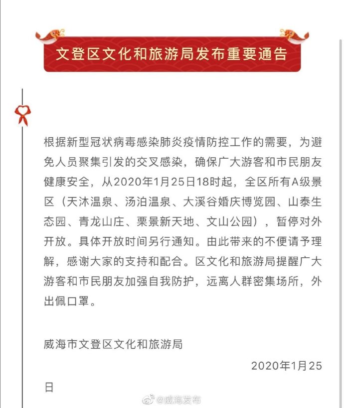 ????從2020年1月25日18時起 ,全區所有A級景區(天沐溫泉、湯泊溫泉、大溪谷婚慶博覽園、山泰生態園、青龍山莊、栗景新天地、文山公園),暫停對外開放,具體開放時間另行通知。