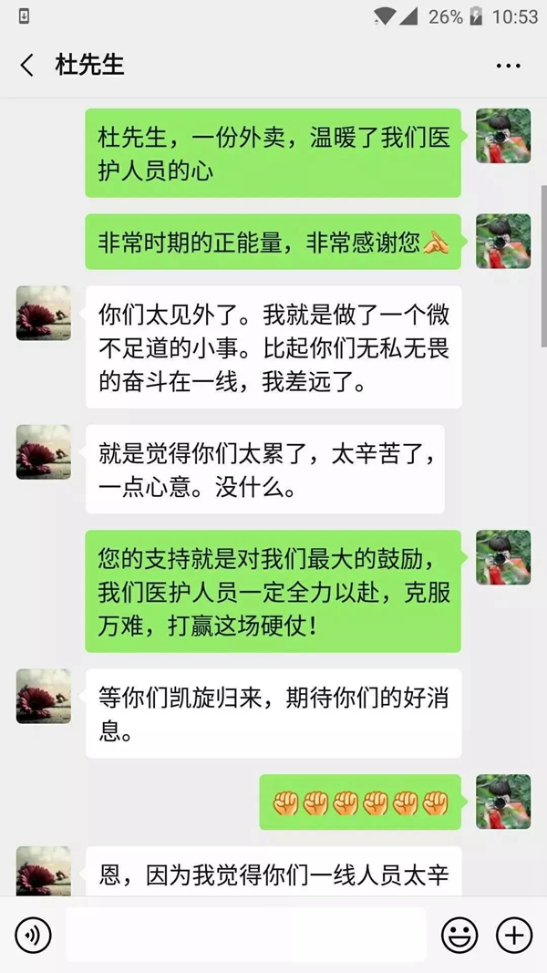 ????中午十一時許,在呼吸內科病區,醫護人員意外收到一份神秘的午餐,沒有送餐人的姓名,也沒有收餐人的姓名。大家正感到迷惑,外賣小哥說,這是一位愛心人士送給你們醫護人員的,大家放心吃吧。呼吸內科副主任李紅娟趕緊拍下了外賣小哥手里的訂餐電話,給這個號碼發去了感謝短信。很快,她收到了短信回復:“你們醫護人員大過節的還在堅守崗位,我由衷地感到佩服。雖然我不能和你們一樣奮斗在一線,可像我一樣千千萬萬的老百姓都在默默為你們加油……”