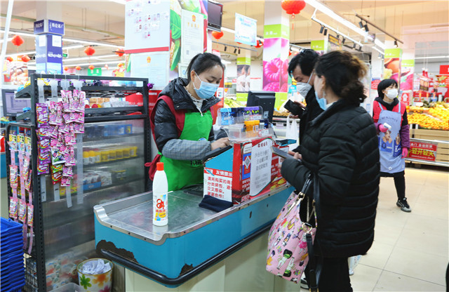 ????1月30日上午,記者又跟隨臨港區市場監督管理局工作人員來到位于汪疃鎮的家家悅超市。超市門口張貼的防控疫情溫馨提示十分醒目,超市工作人員正對每一位進店顧客進行體溫測量,確保進店顧客體溫正常。