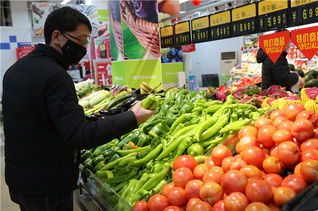 ????在蔬菜、水果選購區,產品豐富、貨架豐盈,不少市民正在選購商品。家住陽光花園小區的胡先生說:“幾天沒出門了,超市和往常沒什么區別,不用囤也不用搶,最近家里菜沒了,出來稍微買點。”