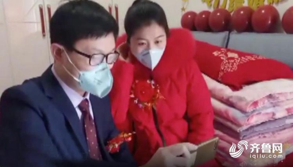 這天上午,在菏澤開發區佃戶屯街道辦事處,李志強與妻子舉行了一場特殊而簡單的婚禮。除了新郎新娘,婚禮現場只到了五位嘉賓。通過視頻聊天,李志強向岳父岳母匯報了結婚的喜訊,老人們短暫見證了結婚的瞬間。