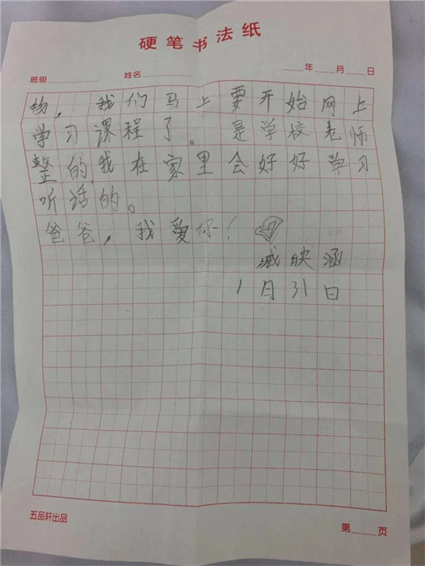 “爸爸:我想你了!你都好多天沒回來了。媽媽告訴我,你一直在醫院工作,抗戰疫情、治病救人。爺爺奶奶和我媽媽都很想你,也很擔心你。希望辛苦工作的同時一定好好的保護自己。偉大的爸爸,你是我心中的大英雄,我們希望你早點回家。我在家里每天都練字、看書、拉二胡,有時候也會玩游戲、做家務,我們馬上要開始網上學習課程了,是學校老師整的,我在家里會好好學習聽話的?!?/p>