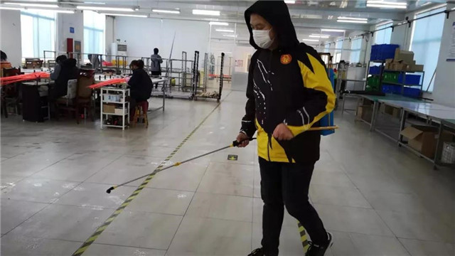 今天是威海廣泰特種車輛有限公司大面積開復工的第一天,在裝配車間內,工作人員們全都戴著口罩忙碌于裝配生產線上。為了做好工作人員的防疫保障工作,除了進出廠區登記、體溫測量外,公司還安排工作人員用配置好的84消毒液對廠區公共區域每天進行兩次無死角的噴灑消毒工作。在各班組的工作臺上也放置著小瓶消毒液,便于員工隨時消毒。企業班車還設置了班車長,每天負責為員工測量體溫,檢查口罩佩戴情況。