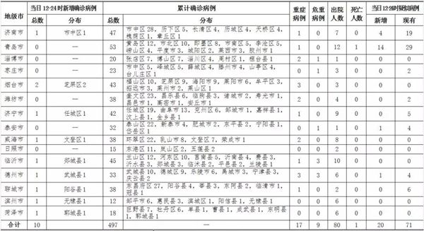 ??????2020年2月11日12-24時,山東省報告新型冠狀病毒肺炎新增確診病例10例,累計確診病例497例(含重癥病例17例,危重癥病例9例,治愈出院80例,死亡病例1例);新增疑似病例20例,現(xiàn)有疑似病例71例。截至目前,追蹤到密切接觸者13482人,已解除醫(yī)學(xué)觀察9966人,診斷為疑似或確診245例,尚有3271人正在接受醫(yī)學(xué)觀察。