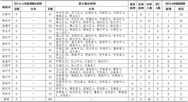 2020年2月12日0-12時(shí),山東省無(wú)新增新型冠狀病毒肺炎確診病例,累計(jì)確診病例497例(含重癥病例15例,危重癥病例9例,治愈出院90例;德州市新報(bào)告死亡病例1例);新增疑似病例5例,現(xiàn)有疑似病例71例。截至目前,追蹤到密切接觸者13666人,已解除醫(yī)學(xué)觀察10180人,診斷為疑似或確診250例,尚有3236人正在接受醫(yī)學(xué)觀察。