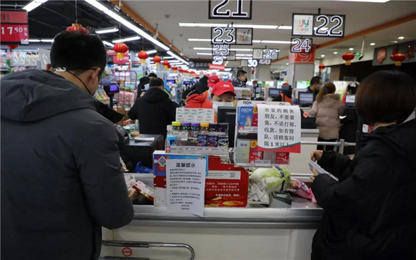 超市的小喇叭廣播里不斷播放“快進快出、少次多買、買完立走、不要逗留、錯峰購物、不要帶孩子來超市”等提示語言。在收款區及商品擺放區,隨處可見寫有諸如 “請隨買隨走不要逗留”“如有排隊,請顧客間隔1米以上”等提示貼。