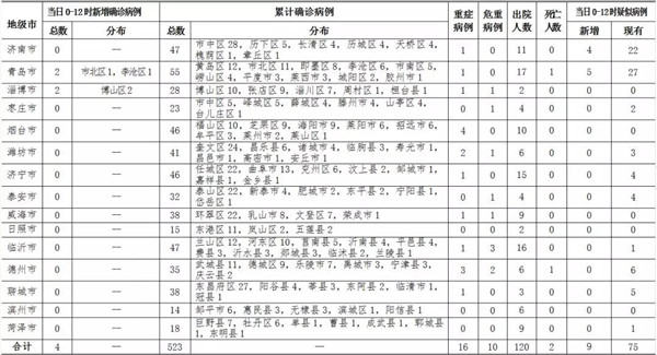 2020年2月14日0-12時,山東省報告新增新型冠狀病毒肺炎確診病例4例,累計確診病例523例(含重癥病例16例,危重癥病例10例,治愈出院120例,死亡病例2例);新增疑似病例9例,現(xiàn)有疑似病例75例。截至目前,追蹤到密切接觸者14866人,已解除醫(yī)學(xué)觀察11070人,診斷為疑似或確診病例262例,尚有3534人正在接受醫(yī)學(xué)觀察。