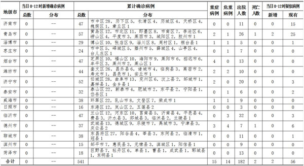 2020年2月17日0-12時,山東省無新增新型冠狀病毒肺炎確診病例,累計確診病例541例(含重癥病例15例,危重癥病例14例,治愈出院182例,死亡病例2例);新增疑似病例2例,現有疑似病例56例。截至目前,追蹤到密切接觸者15823人,已解除醫學觀察12383人,診斷為疑似或確診病例289例,尚有3151人正在接受醫學觀察。