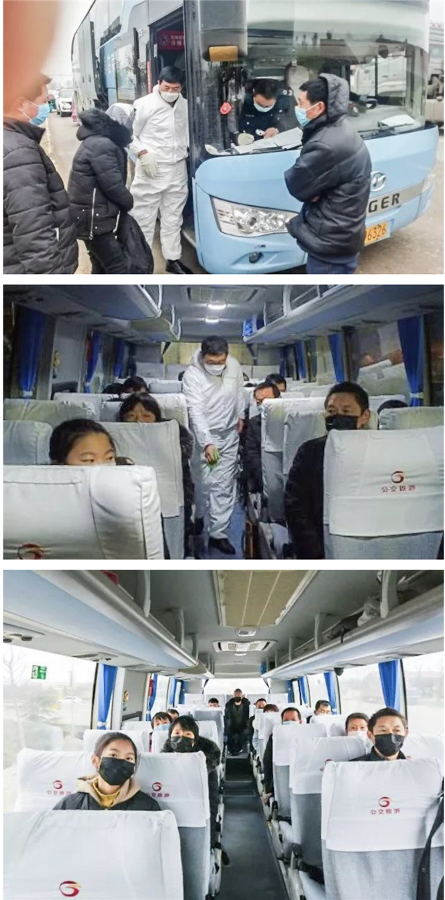 ??????下午14:35分,頂風冒雪9小時后,用工“專車”準時到達目的地——菏澤市巨野縣和鄄城縣。此時,駕駛員變身“防疫員”,嚴格按照相關規定對64名乘車人員核實身份、測溫消毒,待一切防護措施到位后方才組織有序登車。