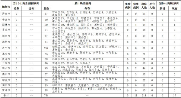2020年2月23日0-12時(shí),山東省無(wú)新增新型冠狀病毒肺炎確診病例,累計(jì)確診病例754例(含重癥病例5例,危重癥病例11例,治愈出院318例,死亡病例4例);無(wú)新增疑似病例,現(xiàn)有疑似病例17例。截至目前,追蹤到密切接觸者16608人,已解除醫(yī)學(xué)觀察14793人,診斷為疑似或確診病例291例,尚有1524人正在接受醫(yī)學(xué)觀察。