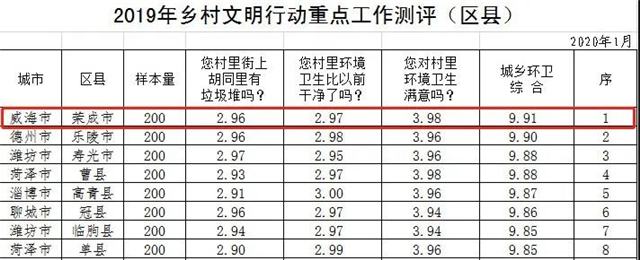 ??????在山東省2019年度城鄉環衛一體化工作滿意度抽查中,榮成市城鄉環衛一體化工作成績在全省排名第一。