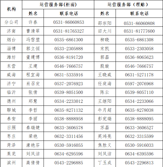 ????為全力支持打贏新型冠狀病毒感染的肺炎疫情阻擊戰(zhàn),在疫情防控關(guān)鍵期充分發(fā)揮保險(xiǎn)保障作用,體現(xiàn)保險(xiǎn)服務(wù)社會(huì)的責(zé)任擔(dān)當(dāng),太平人壽山東分公司在理賠服務(wù)、續(xù)期繳費(fèi)、客戶服務(wù)及保險(xiǎn)責(zé)任拓展等方面推出一系列優(yōu)惠政策,現(xiàn)將優(yōu)惠政策的對(duì)應(yīng)部門(mén)及聯(lián)系人、聯(lián)系方式公布如下: