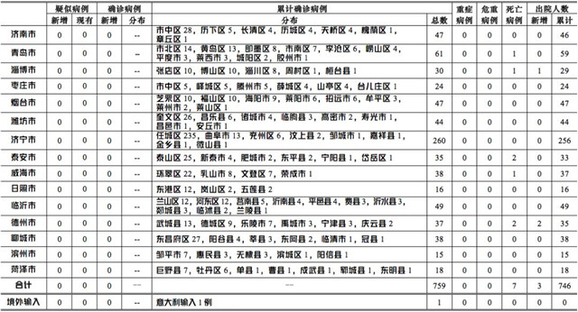 ??????2020年3月16日0-12時,山東省本地無新增確診病例,無新增疑似病例,累計報告確診病例759例。無重癥病例、危重癥病例;累計死亡病例7例;新增治愈出院3例,累計治愈出院746例。