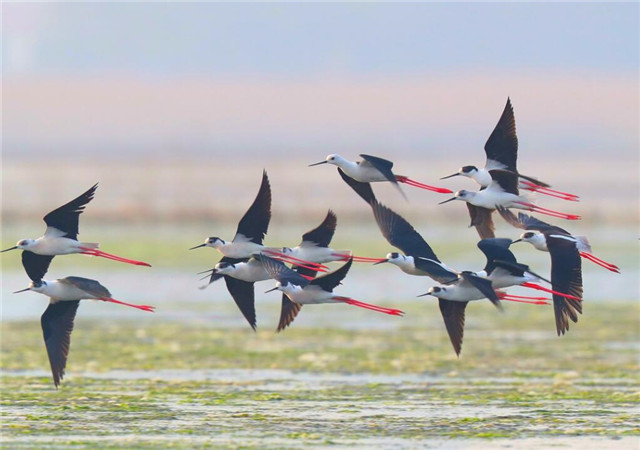??????移步河道,天空澄碧,纖云不染。天晴得像一張藍紙,幾片薄薄的白云,像被陽光曬化了似的,隨風緩緩浮游著。春水碧于天,香水河河面上鳥兒云集、游弋覓食,盡情享受春日的和風暖陽。一陣輕風吹來,吹得水面波紋如綾,吹得人春衫輕開,衣角飛揚。