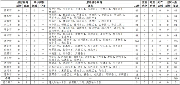 備注:境外輸入病例單獨(dú)統(tǒng)計(jì),其他病例按確診時(shí)醫(yī)院所在縣區(qū)統(tǒng)計(jì)。(來(lái)源:健康山東)