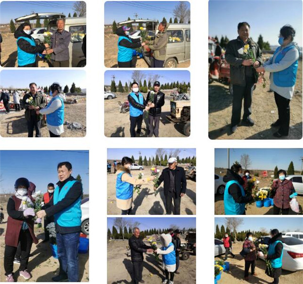 志愿者們為前來祭祀的村民分發鮮花,勸導前來祭祀的村民將紙錢換成鮮花,倡導文明祭掃、綠色清明,從點滴做起,用文明祭掃的實際行動和文明健康的生活方式引領時代文明新風,度過一個文明、生態、平安的清明節。