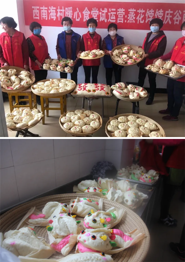 ??????4月19日,榮成石島桃園街道西南海村暖心食堂里人聲鼎沸,熱鬧非凡。隨著鍋蓋的掀開,一個個色彩繽紛、形態各異的花餑餑在熱氣騰騰的蒸汽中露出了生動美麗的姿容。谷雨節當日,該街道西南海村新時代文明實踐所20余名巾幗志愿者在這里蒸花餑餑慶谷雨,宣告西南海村暖心食堂試運營。