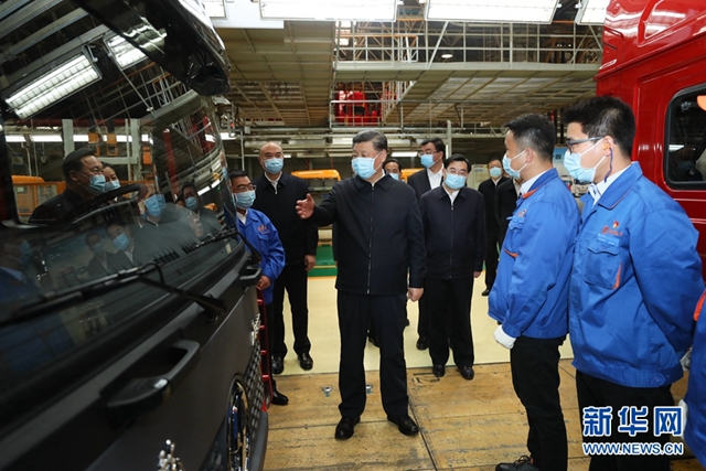 ????22日,習近平在西安考察復工復產和經濟社會恢復運行等情況。陜西汽車控股集團有限公司是西北地區有影響力的制造企業。習近平詳細了解產品研發、生產、銷售和復工復產情況,對他們克服疫情影響創產銷歷史新高表示贊賞。總裝車間內一片繁忙景象。習近平察看內飾生產線、總裝配生產線,饒有興致登上裝配完成的民用重型卡車駕駛室,向技術人員詢問產品性能和操作流程。習近平強調,制造業是國家經濟命脈所系。國有大型企業要發揮主力軍作用,在抓好常態化疫情防控的前提下,帶動上下游產業和中小企業全面復工復產。習近平指出,新時代陜西要有勇立潮頭、爭當時代弄潮兒的志向和氣魄,既要抓住西部大開發、共建“一帶一路”等重大機遇,又要善于從眼前的危機和挑戰中搶抓和創造機遇,不斷發展新模式、新業態、新技術、新產品,創造新的更大業績,邁上新的臺階。