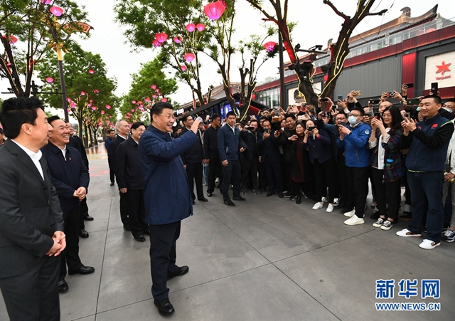 ????4月20日至23日,中共中央總書記、國家主席、中央軍委主席習近平在陜西考察。這是4月22日,習近平在西安大唐不夜城步行街考察時,向游客揮手致意。 新華社記者 謝環馳 攝