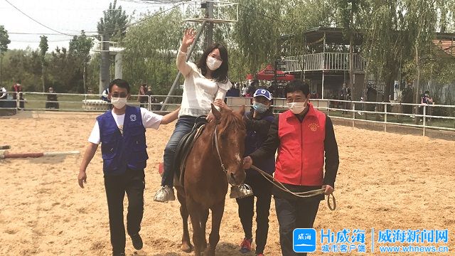 ??????當天,金辰樂園還為殘疾人朋友推出了騎馬體驗活動。袁玉等殘疾人分別由志愿者從輪椅上抱上馬背,并由一名志愿者牽馬,兩名志愿者從左右方保護下,繞馬場一圈。袁玉告訴記者,這是自己第一次騎馬,這次難得的體驗讓她感到幸福又激動。