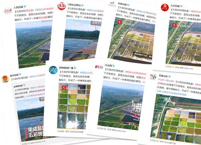 ??????近日,榮成多彩鹽田美如調(diào)色盤喜提微博熱搜。@人民日報、@三聯(lián)生活周刊、@科普中國、@大眾日報、@文旅山東等官方大V紛紛轉(zhuǎn)發(fā),更有網(wǎng)友留言愛上這款可鹽可甜可職業(yè)的“眼影盤”。