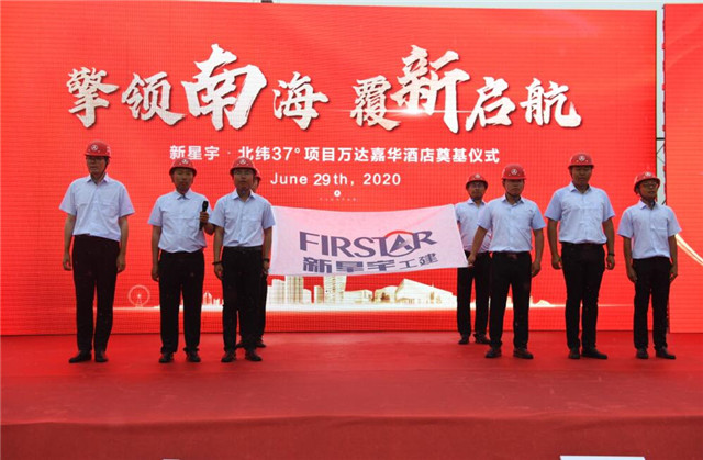 ??????6月29日,南海新區新星宇·威海萬達嘉華酒店項目開工奠基儀式舉行。現場,一輛輛工程車有序擺列,打樁機高高聳立,整裝待發。