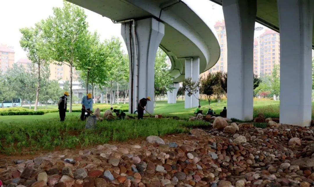 ??????此處立交橋下常年光照不足,水土易流失,加上又是鹽堿地,不利于綠化苗木的成活,因此結合先進的現代造景工藝,對橋下綠地進行“旱溪”改造。