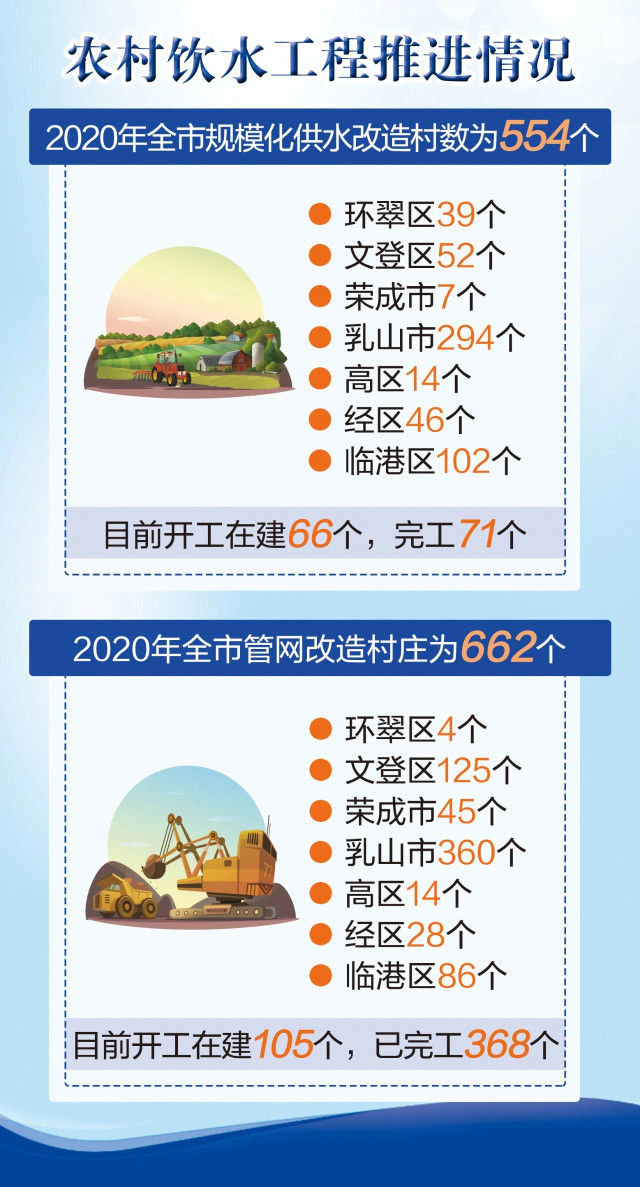 ??????記者從市水務局獲悉,今年,全市規模化供水改造村數為554個,其中,環翠區39個、文登區52個、榮成市7個、乳山市294個、高區14個、經區46個、臨港區102個。目前,開工在建66個,完工71個。2020年全市管網改造村莊為662個,其中,環翠區4個、文登區125個、榮成市45個、乳山市360個、高區14個、經區28個、臨港區86個。目前,開工在建105個,已完工368個。目前,總體工作已達到計劃進度。