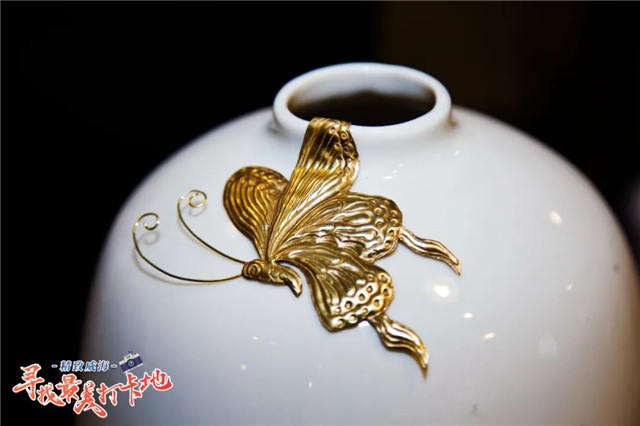 “鋦得漂亮才叫出活,其實最能體現鋦匠水平的是設計各種造型的鋦釘,讓它與原有器物完美融合,兼具藝術性和實用性。”耿海勝說,正如這個釉色漂亮的名家書法瓷瓶,瓶口有殘缺,耿海勝按照瓷瓶上的蘭花圖案和詩句的意境,設計了一個蝴蝶造型的鋦釘,鋦好后的金色蝴蝶好似停在瓷器上小憩,整個構圖充滿立體感,蝴蝶亦有展翅欲飛的動感。