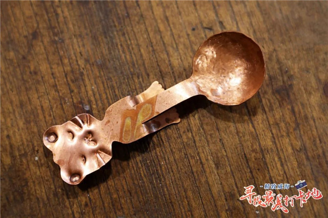 在吉呈軒,除了可以看到破損的器物在耿海勝手中“涅槃重生”,你也可以親自“上陣”,做一回鋦匠。一個看似簡單精巧的銅勺,做起來也并不簡單,需要反復用錘敲出造型、鏨刻圖案、打磨拋光……東西雖小,卻也是匠心演繹!